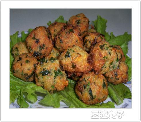 ??豆渣適量、瘦肉1-2兩、雞蛋兩個、青菜少許、面粉適量、食鹽適量。將瘦肉和青菜切碎,和豆渣、雞蛋、面粉一塊兒攪和,調入食鹽,做成丸子,入鍋煮熟即可。